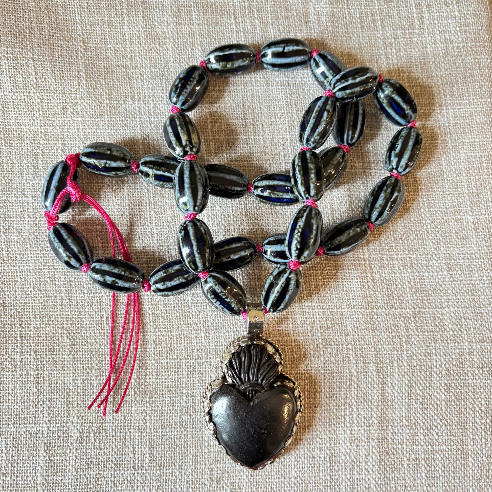 Striped blue-black ceramic barrel beads are hand knotted on magenta-colored cord showcasing an ebony sacred heart set in Tibetan Silver.