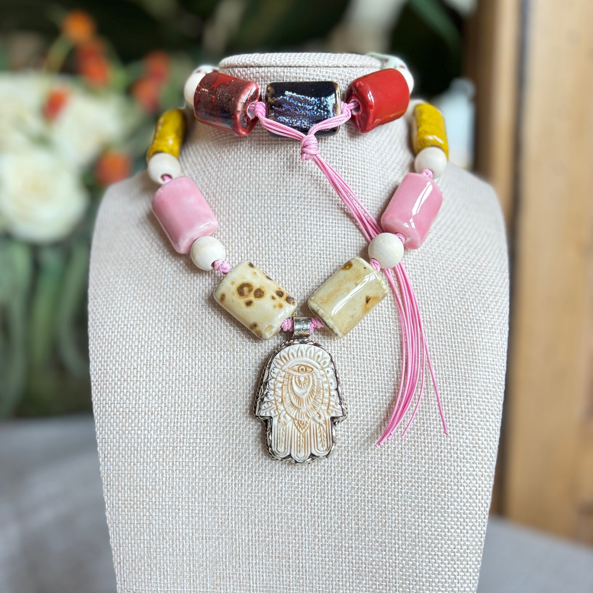 Multi-color ceramic beads are paired with round wood beads and offset by pink cord showcasing a hamsa pendant in carved bone set in Tibetan silver.