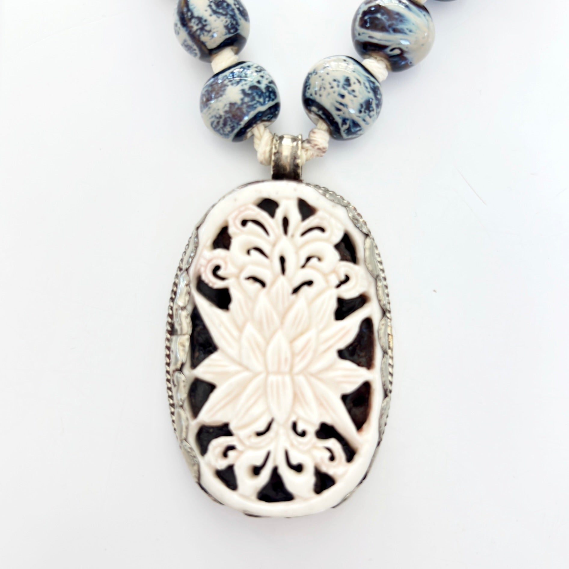 Glazed ceramic beads are hand-knotted on ivory cord and showcase a carved bone pendant of a Lotus Flower set in Tibetan Silver.