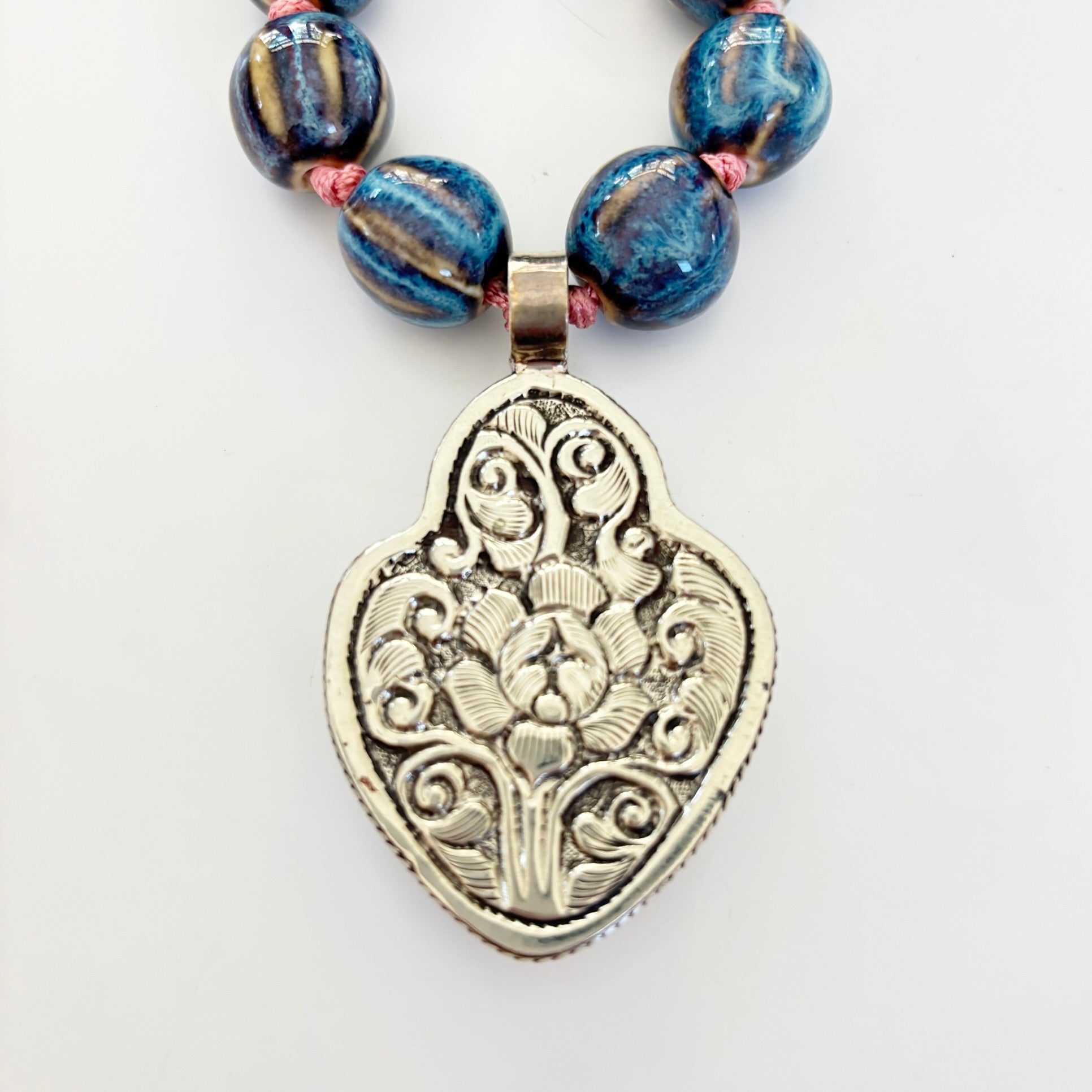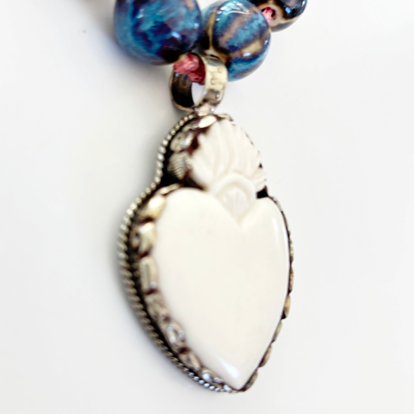 Variegated blue ceramic beads are offset by watermelon pink cord showcasing a carved bone, flaming heart pendant set in Tibetan Silver.